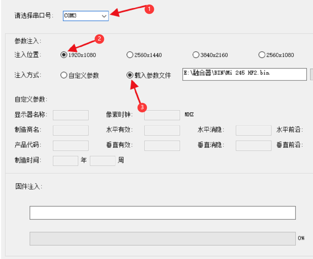 8:下载注入工具并打开看1选择串口号(不要选择COM1,也不要选择kmbox的com口,选除了这两个以外的com口),然后看2根据自己的显示器的分辨率选择注入位置,不知道是多少回头看第三步,然后选择3选择载入参数选择刚刚保存的,然后右边点击注入,然后就会提示注入成功,即可。