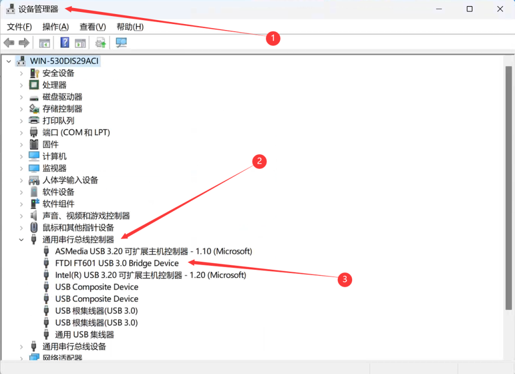 在副机打开设备管理器(先按住WIN+X,然后在按M就可以打开设备管理器)查看下图3的FTDI FT601是否显示,如果不显示说明DMA的线没有插好(DMA板子常量绿灯的情况下)大概率是DMA那头C口插的太松了,用点力插一下就会显示。