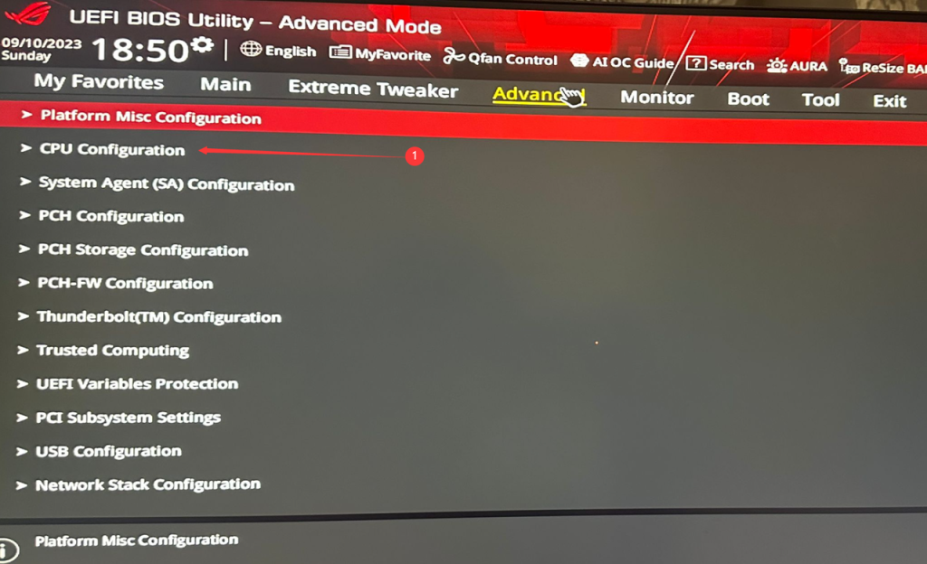 3:点进去CPU Configuration,拉到最下面关闭VXM改成DISABLE(关闭虚拟化步骤)